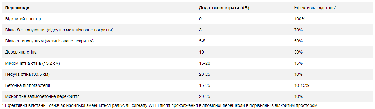 *Ефективна відстань – означає наскільки зменшиться радіус дії сигналу Wi-Fi після проходження відповідної перешкоди в порівнянні з відкритим простором.